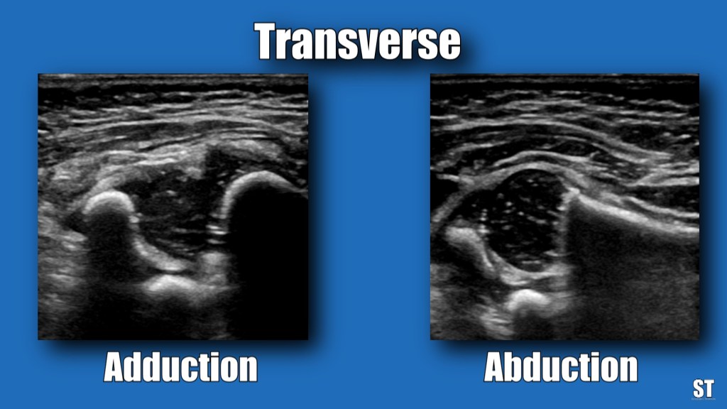 With the patient in lateral decubitus, dynamic imaging is obtained by performing Barlow (adduction or flexion) and Ortolani (abduction) maneuvers. Via the acetabulum you measure the Alpha and Beta angles.