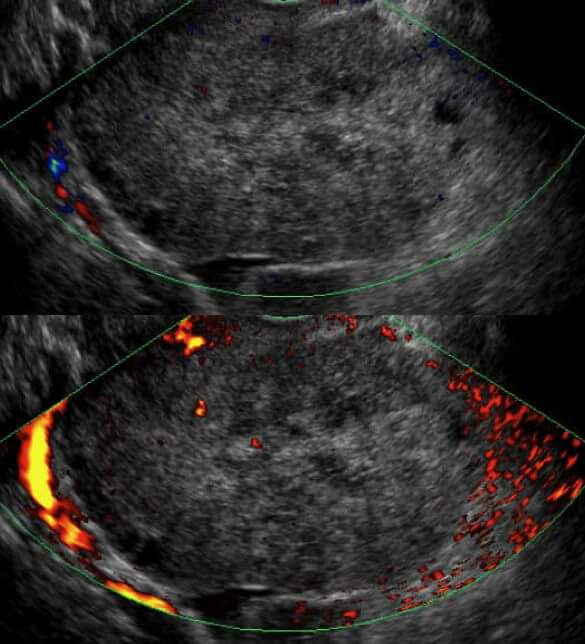- normal Doppler flow can also occasionally be found due to dual supply from both the ovarian and uterine arteries (ovarian artery and a branch from the uterine artery respectively)