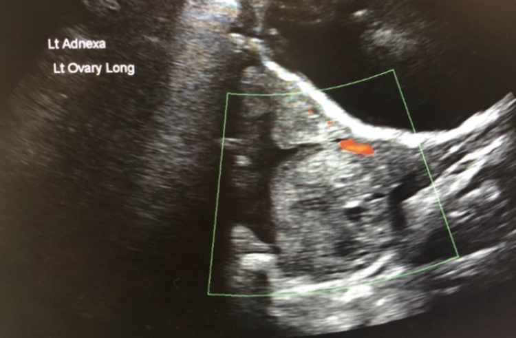 Ultrasound usually shows an enlarged ovary with peripherally displaced follicles, free fluid is often present, no Doppler flow is also often seen (early torsion can still have arterial flow, with venous and lymphatic drainage absent, also the ovary may spontaneously detorse).