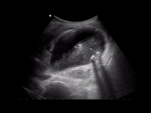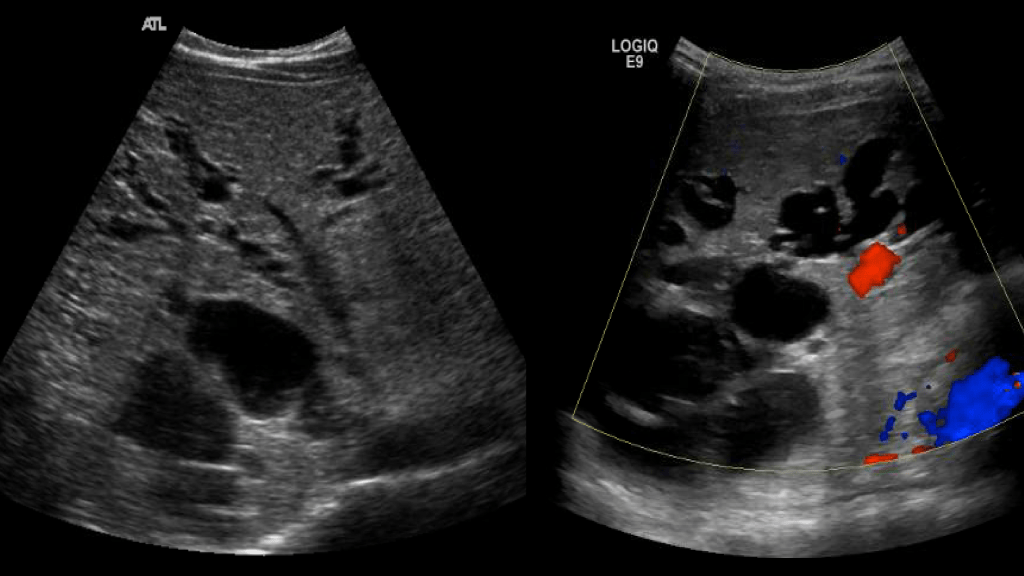 Hemobilia is blood within the bile ducts and is associated with biliary trauma, usually iatrogenic (i.e. biopsy, surgery). Other etiologies include cholangitis, vascular malformations, abdominal traumas and malignancies. The appearance of blood within the biliary tree is similar to blood clots seen in other parts of the body. Often you’ll see intraluminal medium level echoes or hyperechoic material. More acute thrombus is typically less echogenic.