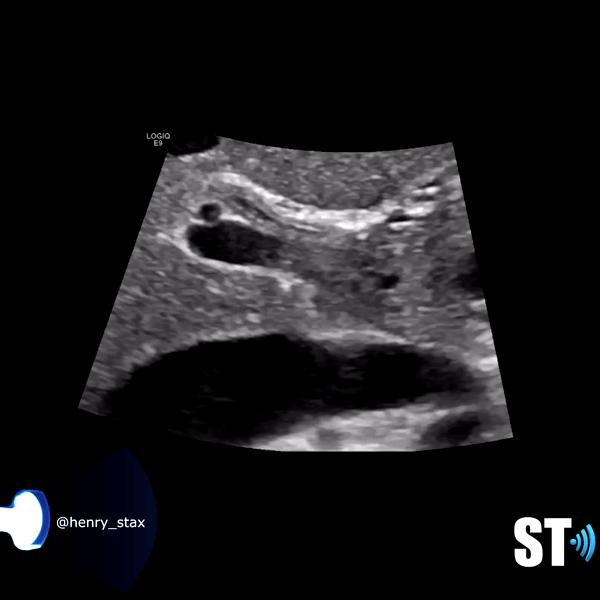The biliary system is made of the cystic duct which comes from GB neck meeting with the hepatic duct forming the common bile duct (CBD) which travels through the hepatoduodenal ligament to the head of the pancreas meeting with the pancreatic duct. The terminal end is at the ampulla of Vater in the duodenum. The normal caliber of the CBD is <7mm (mean 3.4mm). Sonographically it can be imaged at the porta hepatis with the portal triad (portal vein, hepatic artery, CBD) and be differentiated from the vessels by using color Doppler. It can also be imaged the head of the pancreas posterolateral to the gastroduodenal artery.