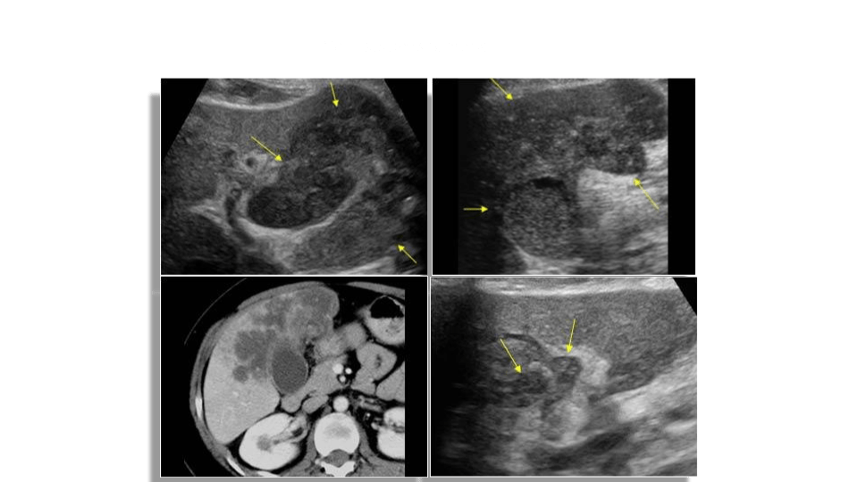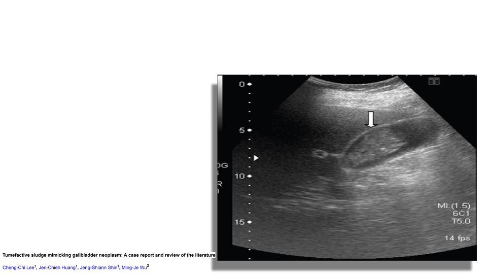 On ultrasound you’ll see low level echoes to echogenic debris that layers in the dependant part of the GB and is mobile with patient position. Sludge may aggregate into clumps which may simulate masses or polyps. This is known as tumefactive sludge. The gallbladder may also be completely filled with sludge making the whole GB complex isoechoic to the liver known as hepatization.
