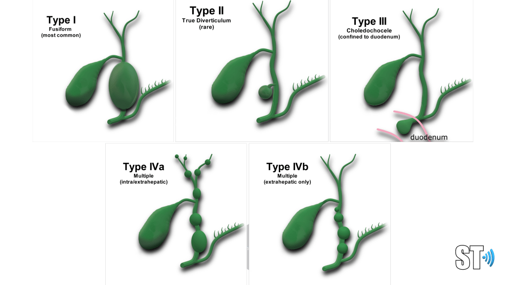 Choledochal cysts are a congenital dilatation of the bile ducts. It is more common in East Asian populations. It is most commonly discovered in childhood, though up to 20% can be found in adults.
