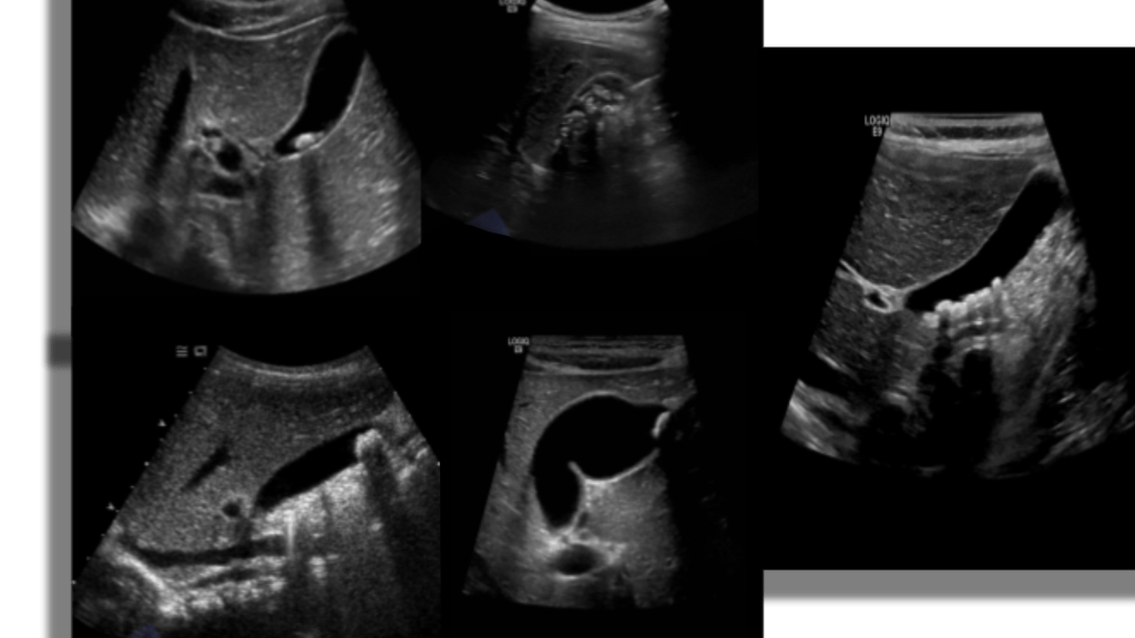 Scanning the GB should include RUQ images of the Liver, biliary tree and gallbladder in sagittal and transverse planes.