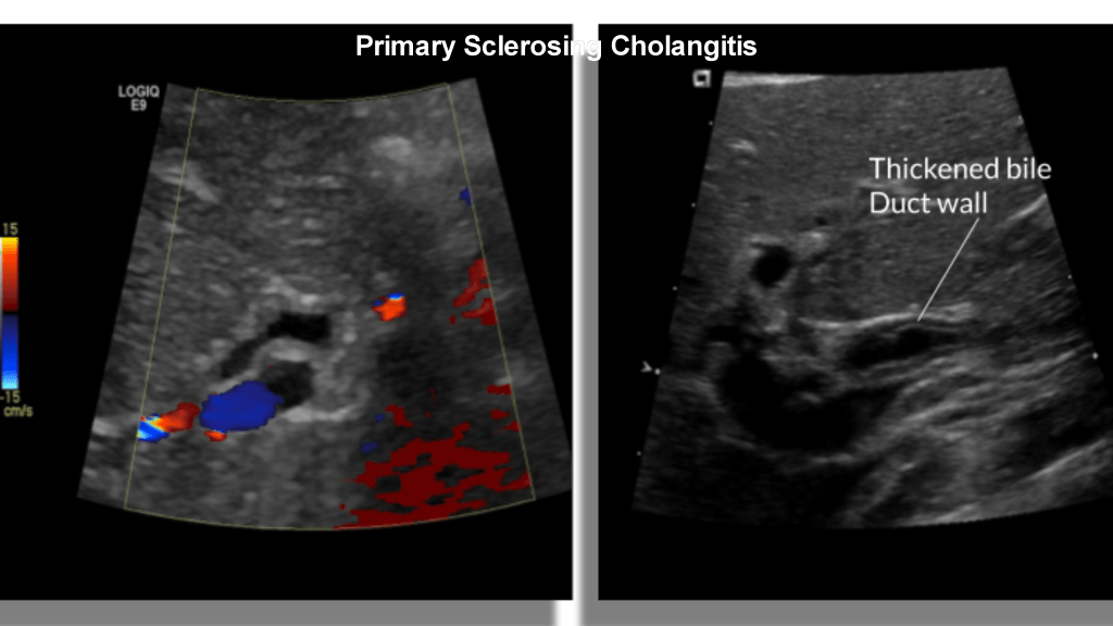 Primary sclerosing cholangitis is a chronic inflammatory condition that occurs in the absence of choledocholithiasis or prior bile surgery. It is thought to be autoimmune in origin and is associated with inflammatory bowel disease, Langerhan cell histiocytosis, immunodeficiency, psoriasis and cystic fibrosis. It tends to be more common in males. Sonographically there is irregular circumferential thickening of the bile duct walls, luminal narrowing, strictures and dilatations. Cholangiocarcinoma develops in 7-30% of cases.