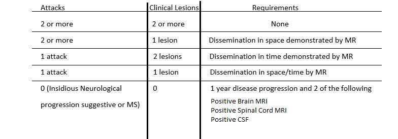 McDonald criteria is a diagnostic system used to diagnose MS. It relies on evidence of CNS damage disseminated in time and space, time representing damage occurring in different anatomical locations and time representing lesions occurring at different times in the presence of no better pathological alternative. It had been revised several times the last one being in 2017.