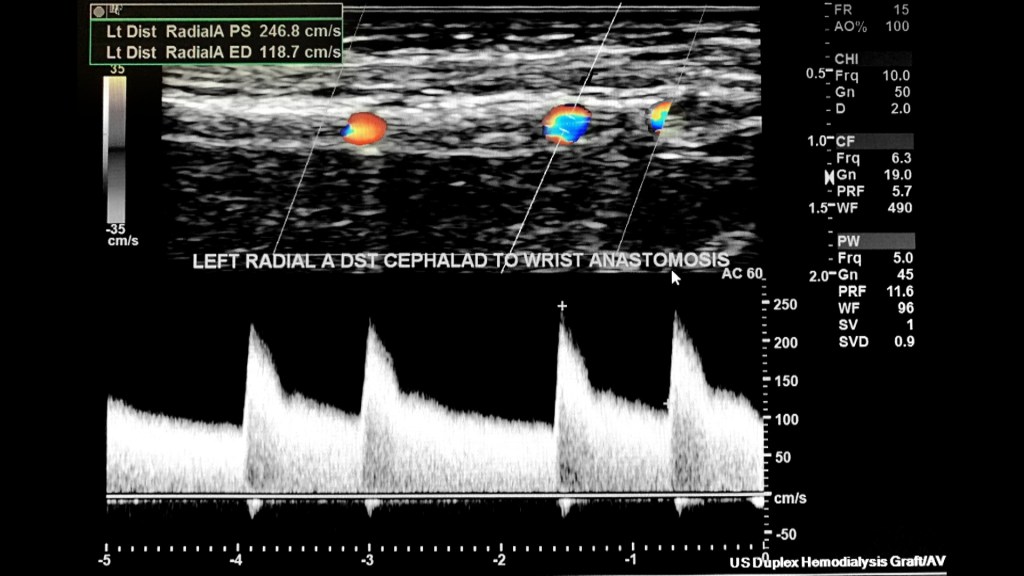 The normal spectral arterial tracing (inflow) proximal to the AVF will be a lower resistant high flow waveform followed by a higher resistance waveform distal to the anastomosis (make sure to evaluate for steal syndrome). The spectral analysis in the radial artery proximal to anastomosis has a high PSV/EDV at 247 cm/s and EDV at 119 cm/s.
