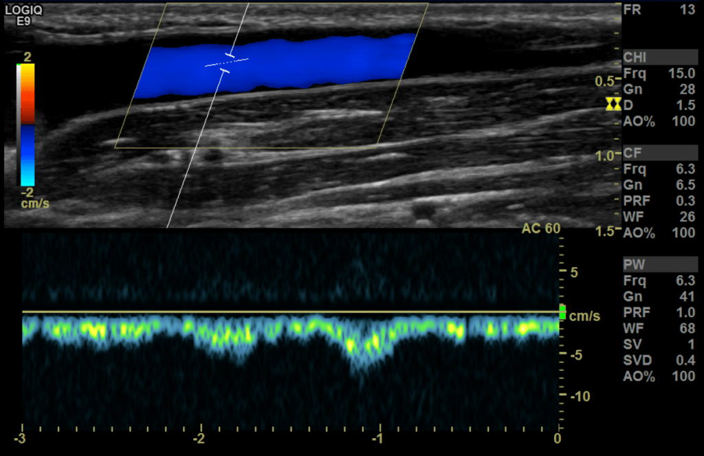 Next we assess the outflow stream (venous side) starting with the subclavian/cephalic vein confluence at the shoulder level followed by the bicep and forearm segments of the outflow stream evaluating for abnormalities such as thrombus, stenosis, occlusions, PSA/aneurysms, etc.