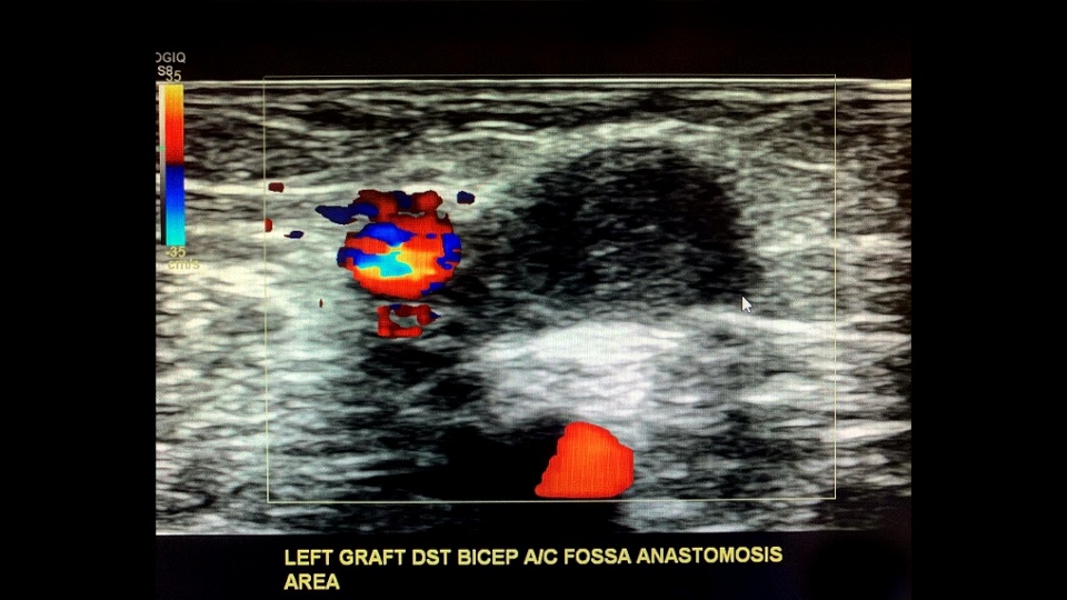 In normally functioning fistulas, waveforms of flow in the supply arteries and throughout the graft are monophasic, with peak systolic velocities of 100-400 cm/sec and end-diastolic velocities of 60-200 cm/s (stenosis at the anastomosis sight is common and has been determined to not adversely effect graft/fistula function and no association between stenosis and graft occlusion has been found.