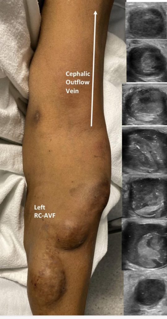 This patient has a left arm radial-cephalic vein AV anastomosis (aka Brescia-Cimino) which is the most common AVF connection.